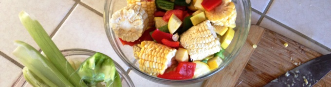 - Chop peppers and summer squash into bite size chunks and corn into approx. 1” disks